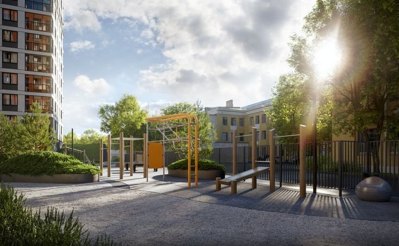 Уютный зеленый двор с тематическими зонами для детей, подростков и взрослых. Спортивная площадка и бесплатный wi-fi.