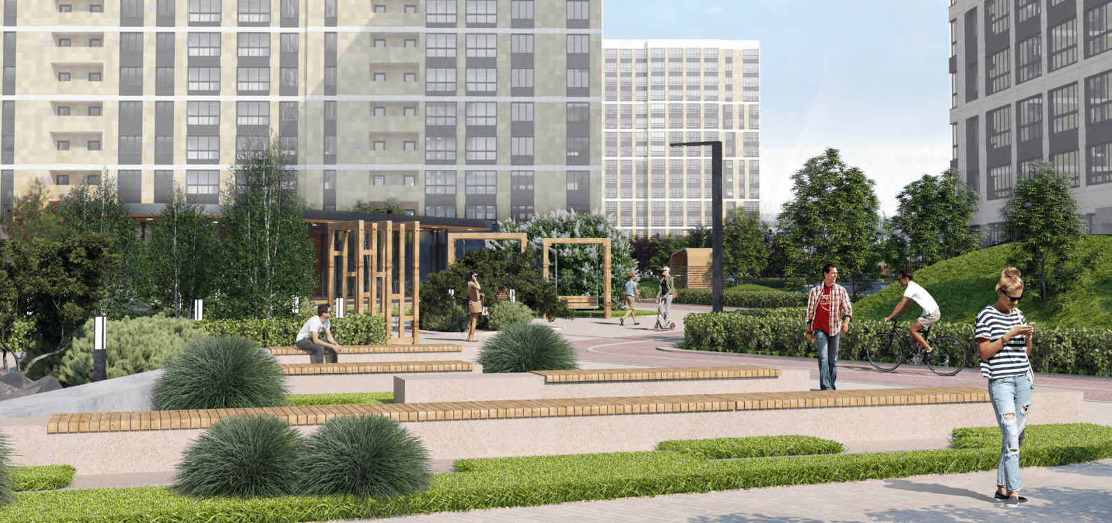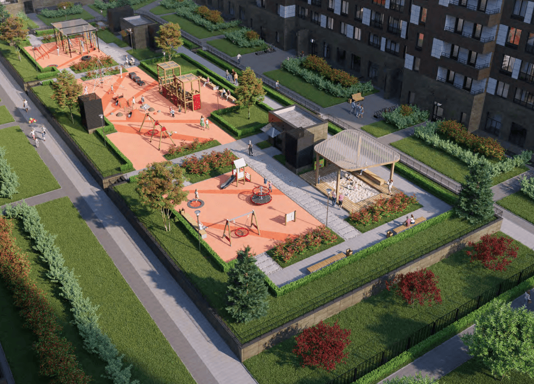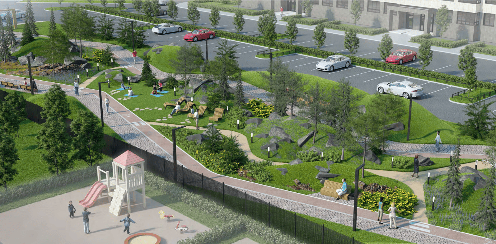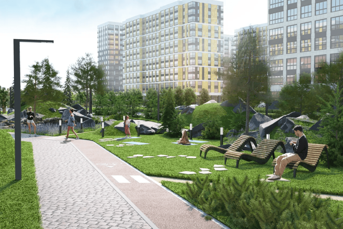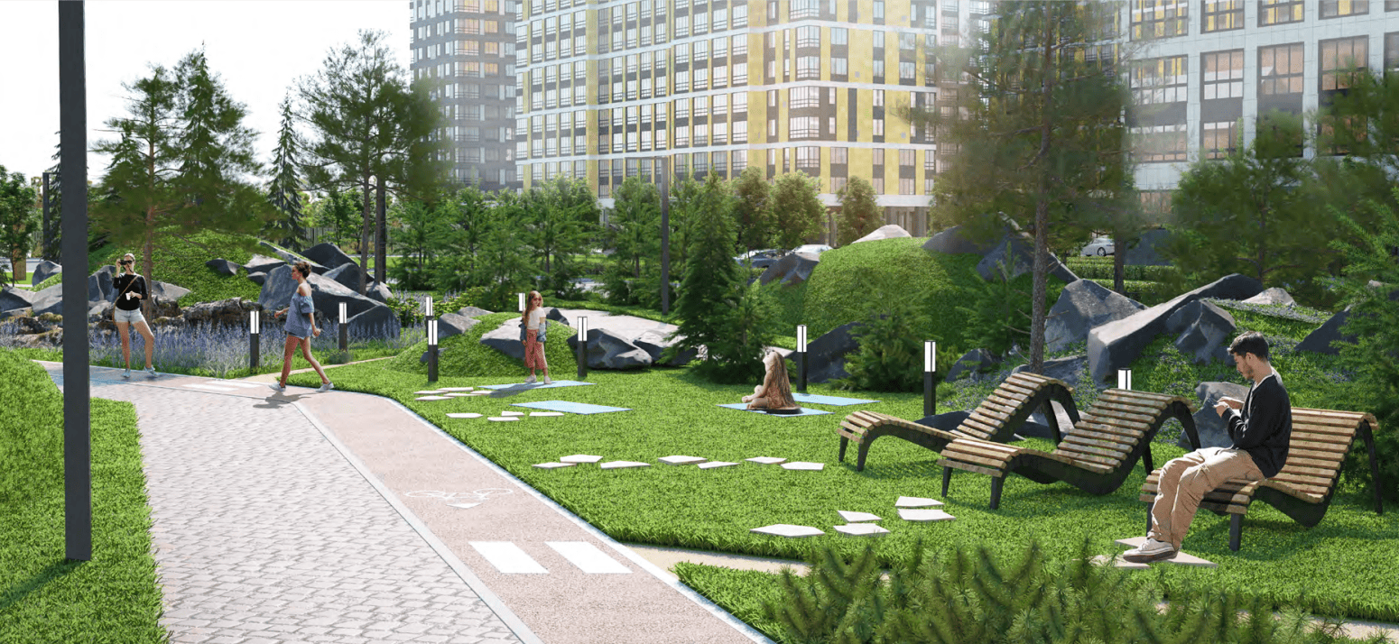 А также детские, спортивные площадки, качели, зоны для йоги и релакса.