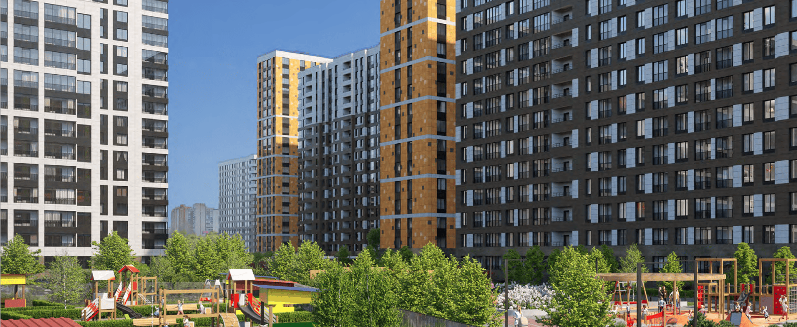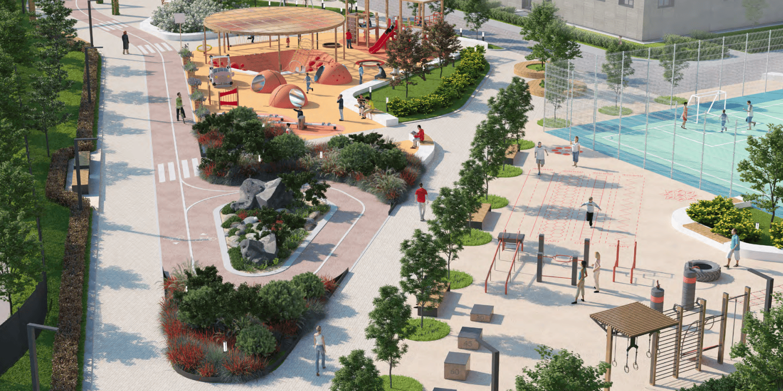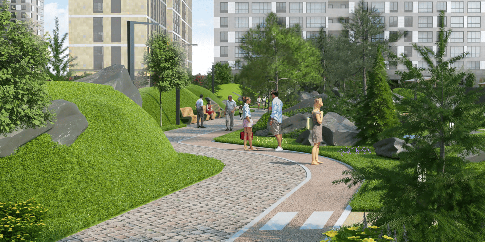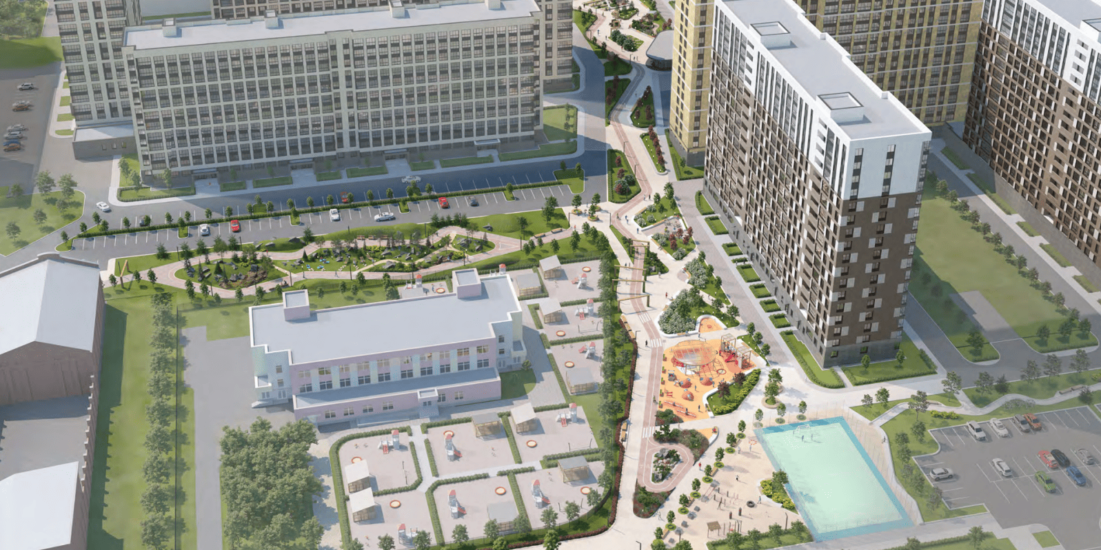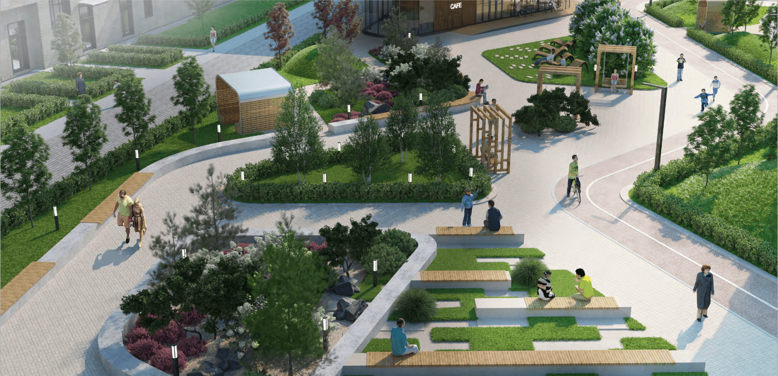 А также детские, спортивные площадки, качели, зоны для йоги и релакса.