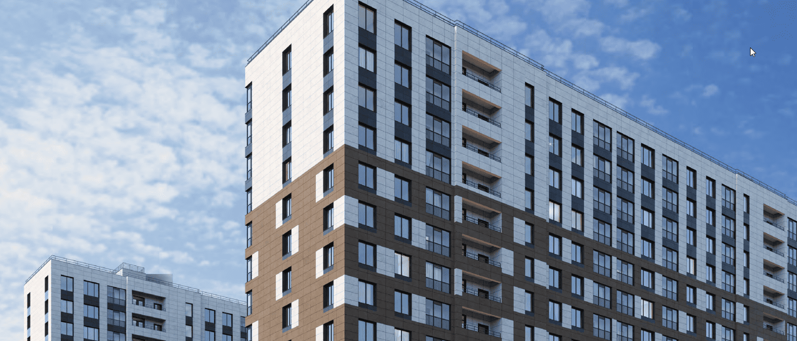 Во внешнем оформлении преобладают натуральные природные цвета, для отделки фасадов используют керамогранит молочного, темно-коричневого, бежевого цветов. Строгая геометрия линий придает внешнему виду зданий динамику. Акцентный архитектурный штрих — мозаичные фасады в оттенках охры.