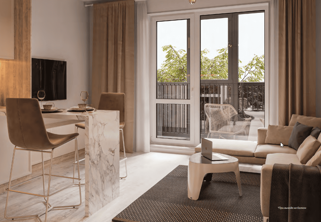 Благодаря панорамному остеклению при выходе на балкон в квартире будет светло даже в пасмурные дни. Комната кажется просторней, открываются живописные виды.