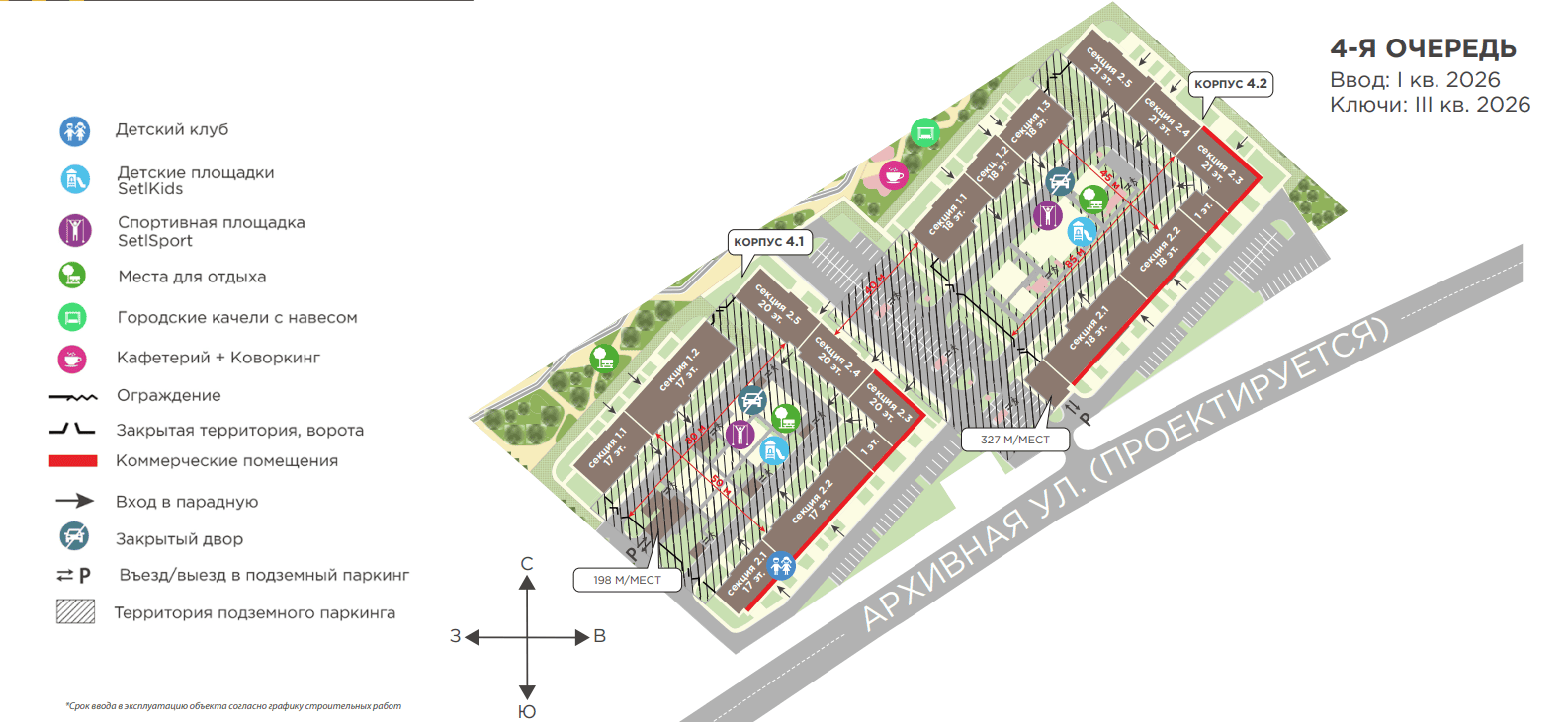 Подземный паркинг на 525 мест, 3-уровневый надземный паркинг. Большие гостевые парковки с зарядками для электромобилей.
