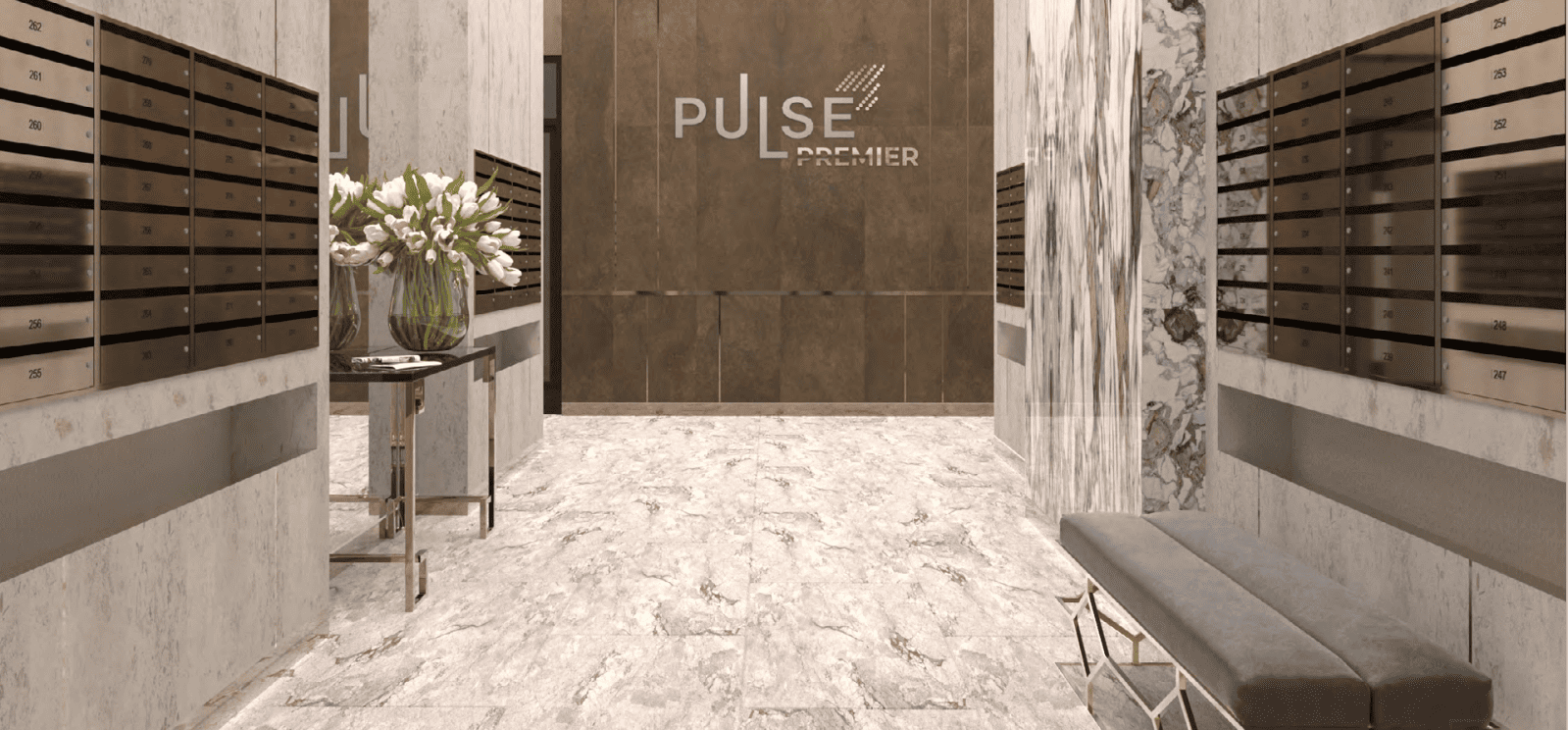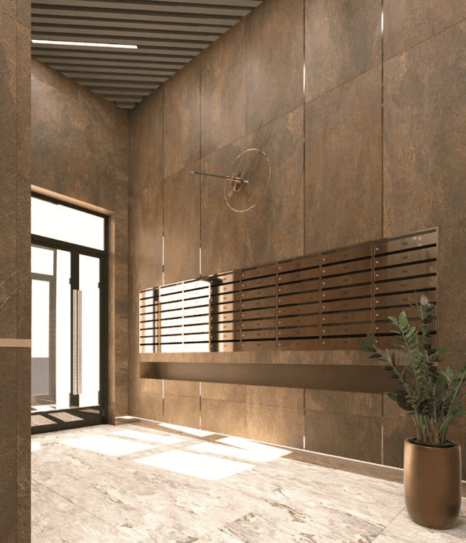 Авторский дизайн, керамогранит природных оттенков с вставками под латунь. Реечный потолок с линейной подсветкой. Акцентная стена из керамогранита, места для ожидания гостей и почтовые ящики под латунь.