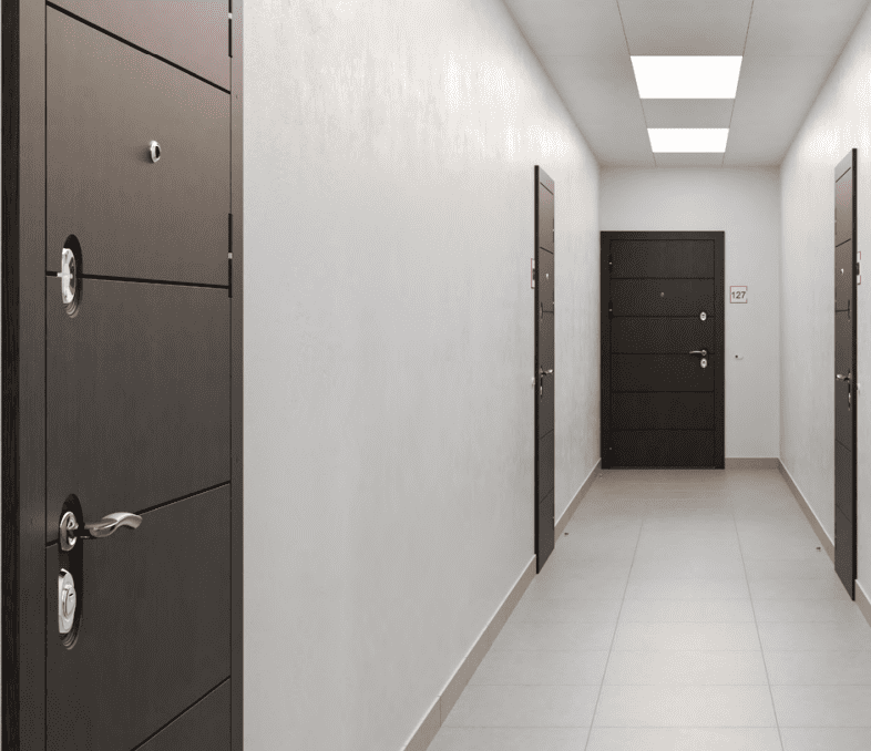 Надежные металлические входные двери в квартиру с декоративными панелями и двумя замками.