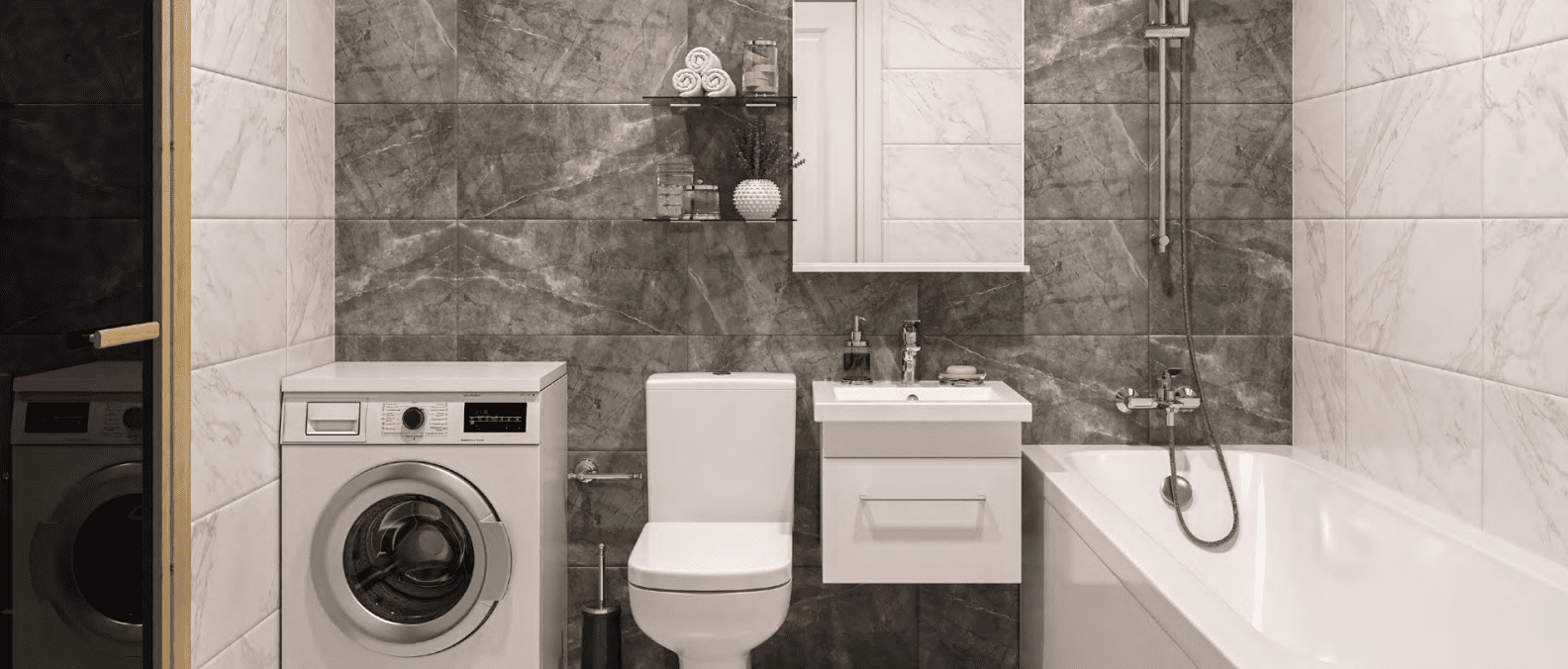 Крупноформатная плитка под мрамор на стенах и полу. Вся сантехника — только от надежных производителей. Акцентная стена в темно-сером цвете. Теплый пол.
